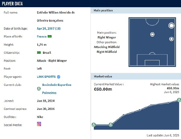 在最新一期的德转身价榜上,埃斯特旺已经达到6000万欧元,追平了恩德里克2024年所创造的巴甲球员身价纪录。